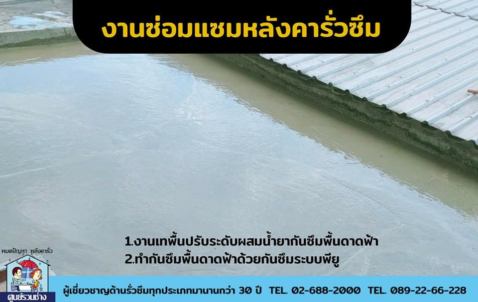 ศูนย์รวมช่าง ซ่อมหลังคารั่วซึม ดาดฟ้ารั่วซึม ห้องน้ำรั่วซึม โรยตัวซ่อมรั่วอาคารสูง งานรั่วซึมทุกประเภททั้งงานบ้าน องค์กร โกดัง โรงงาน ฯลฯ ด้วยการบริการที่ครบวงจรและเทคโนโลยีที่ทันสมัยรวมถึงกันซึมที่นำเข้าจากต่างประเทศมีความยืดหยุ่นและมีประสิทธิภาพสูง ด้วยประสบการณ์การทำงานด้านรั่วซึมมากกว่า 30 ปี พร้อมรับประกันผลงาน ที่จะทำให้คุณมั่นใจไว้วางใจให้เราดูแล