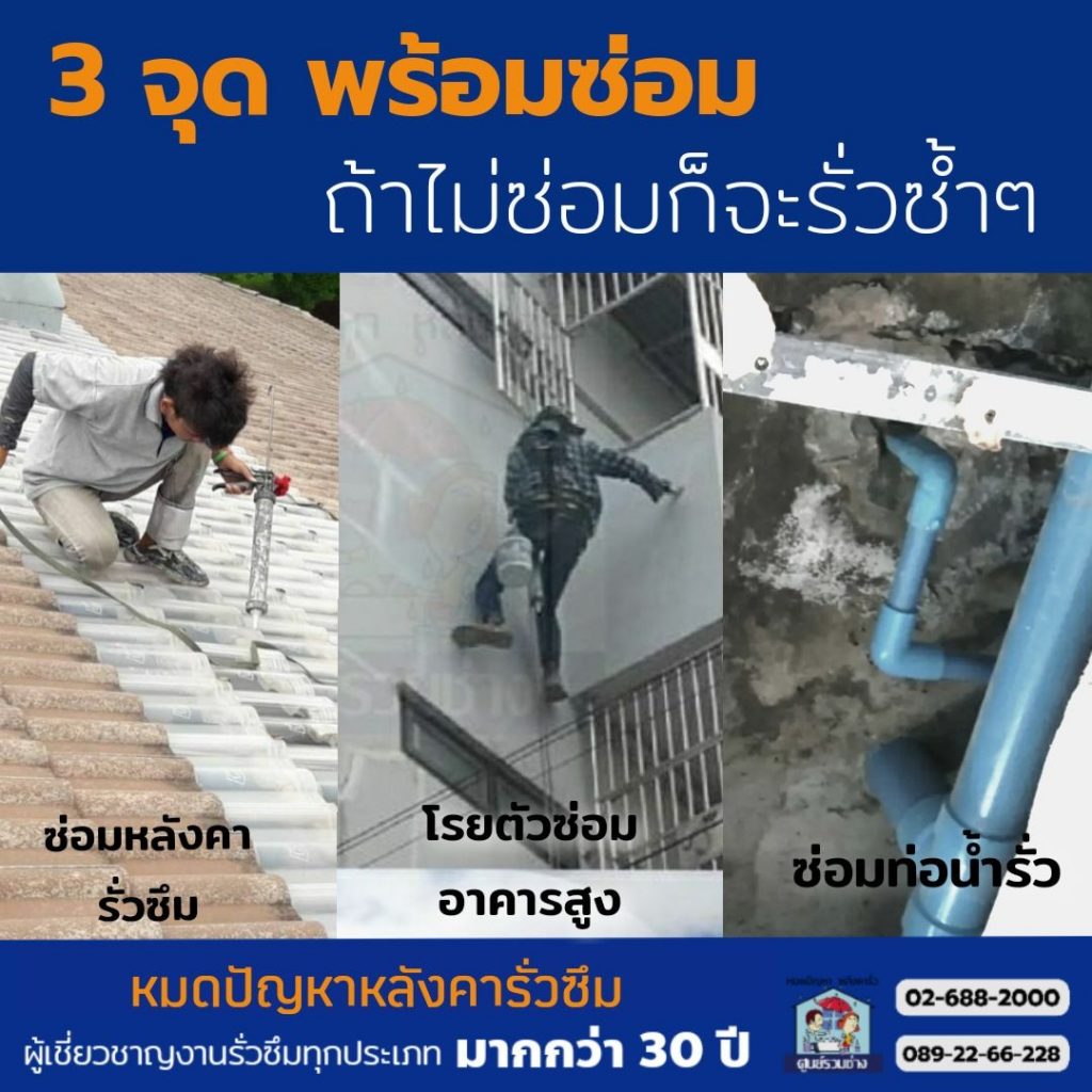 ศูนย์รวมช่าง ซ่อมหลังคารั่วซึม ดาดฟ้ารั่วซึม ห้องน้ำรั่วซึม โรยตัวซ่อมรั่วอาคารสูง งานรั่วซึมทุกประเภททั้งงานบ้าน องค์กร โกดัง โรงงาน ฯลฯ ด้วยการบริการที่ครบวงจรและเทคโนโลยีที่ทันสมัยรวมถึงกันซึมที่นำเข้าจากต่างประเทศมีความยืดหยุ่นและมีประสิทธิภาพสูง ด้วยประสบการณ์การทำงานด้านรั่วซึมมากกว่า 30 ปี พร้อมรับประกันผลงาน ที่จะทำให้คุณมั่นใจไว้วางใจให้เราดูแล
