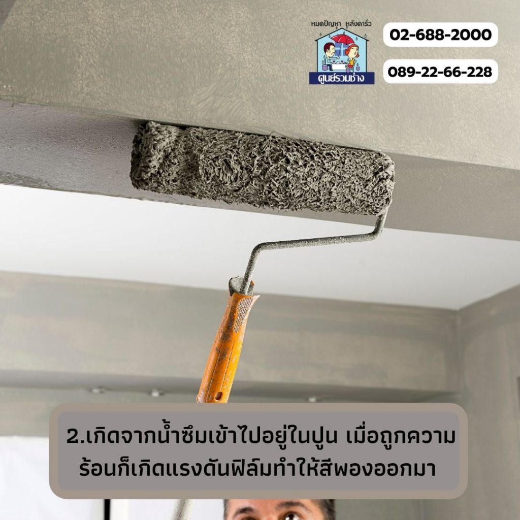 2.เกิดจากน้ำซึมเข้าไปอยู่ในปูน เมื่อถูกความร้อนก็เกิดแรงดันฟิล์มทำให้สีพองออกมา