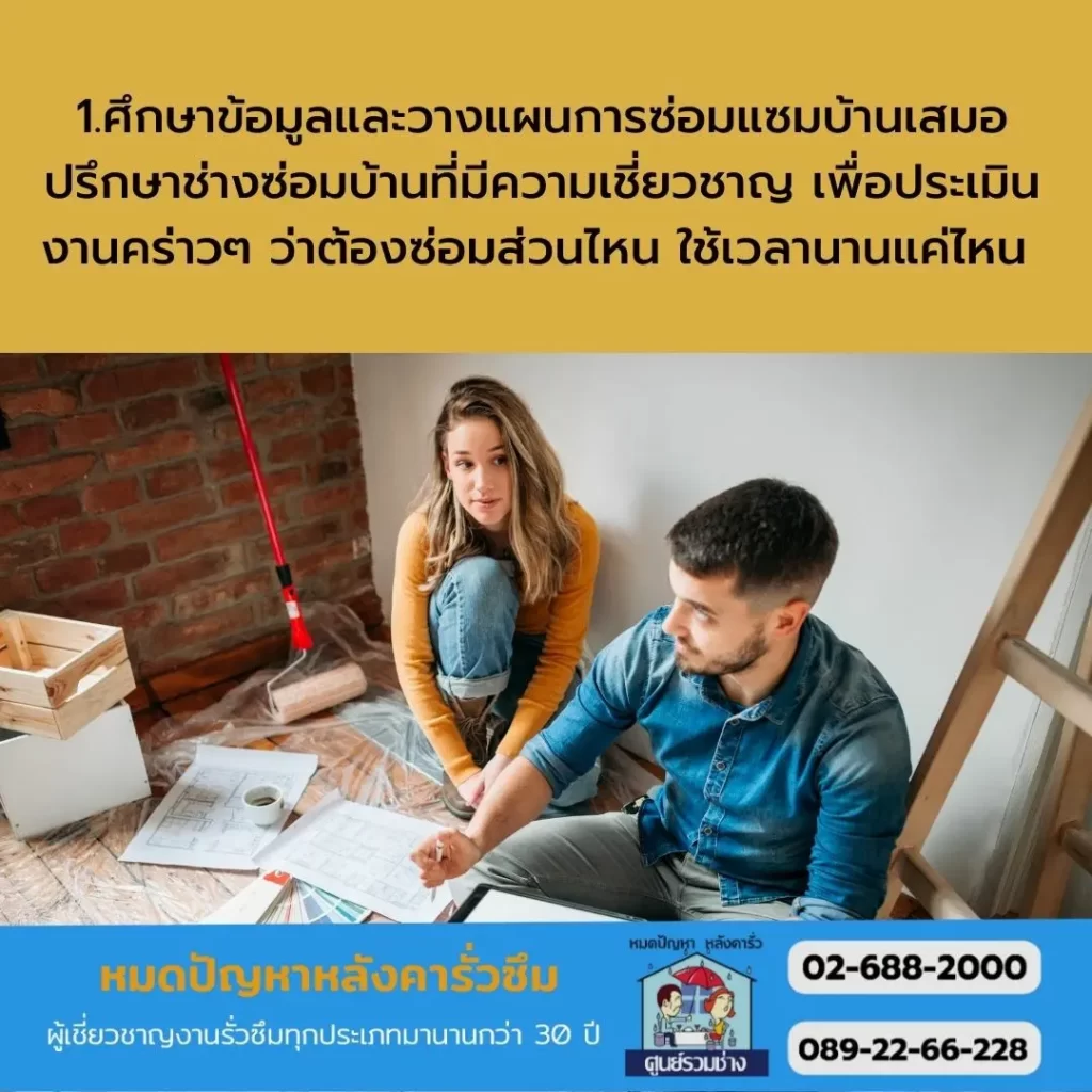 1.ศึกษาข้อมูลและวางแผนการซ่อมแซมบ้านเสมอ ปรึกษาช่างซ่อมบ้านที่มีความเชี่ยวชาญ เพื่อประเมินงานคร่าวๆ ว่าต้องซ่อมส่วนไหน ใช้เวลานานแค่ไหน