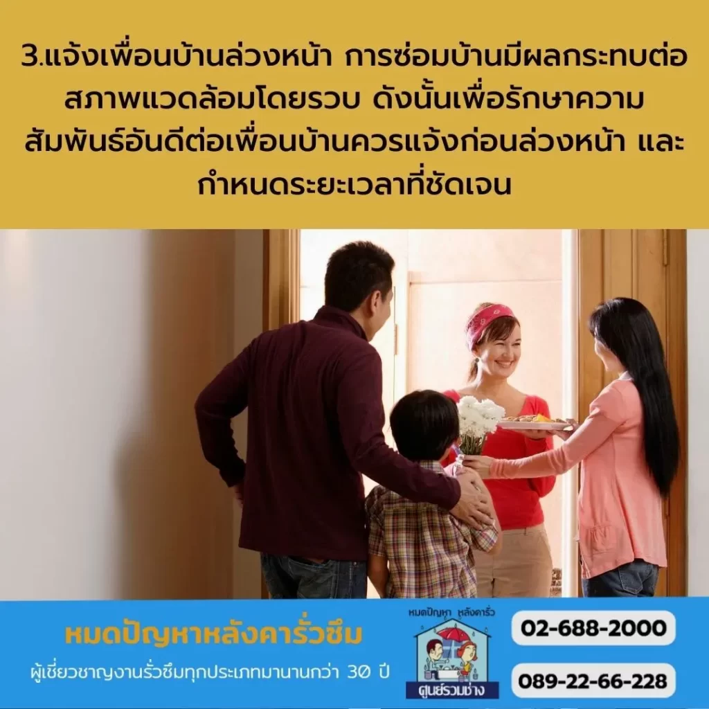 3.แจ้งเพื่อนบ้านล่วงหน้า การซ่อมบ้านมีผลกระทบต่อสภาพแวดล้อมโดยรวบ ดังนั้นเพื่อรักษาความสัมพันธ์อันดีต่อเพื่อนบ้านควรแจ้งก่อนล่วงหน้า และกำหนดระยะเวลาที่ชัดเจน