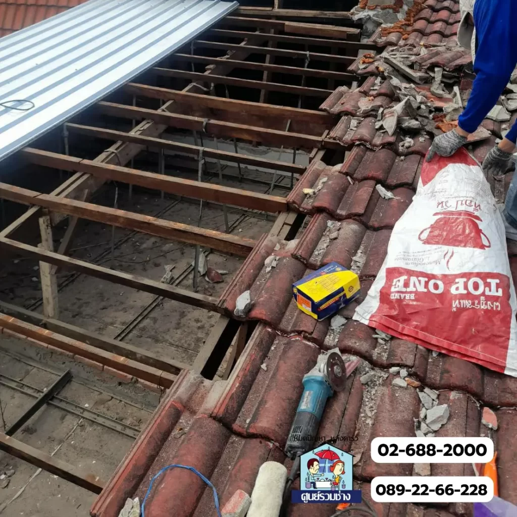 งานรื้อเปลี่ยนมุงหลังคาใหม่ด้วยแผ่นหลังคาเมทัลชีทรุ่นบุฉนวนกันความร้อนพียูโฟมหนา1″