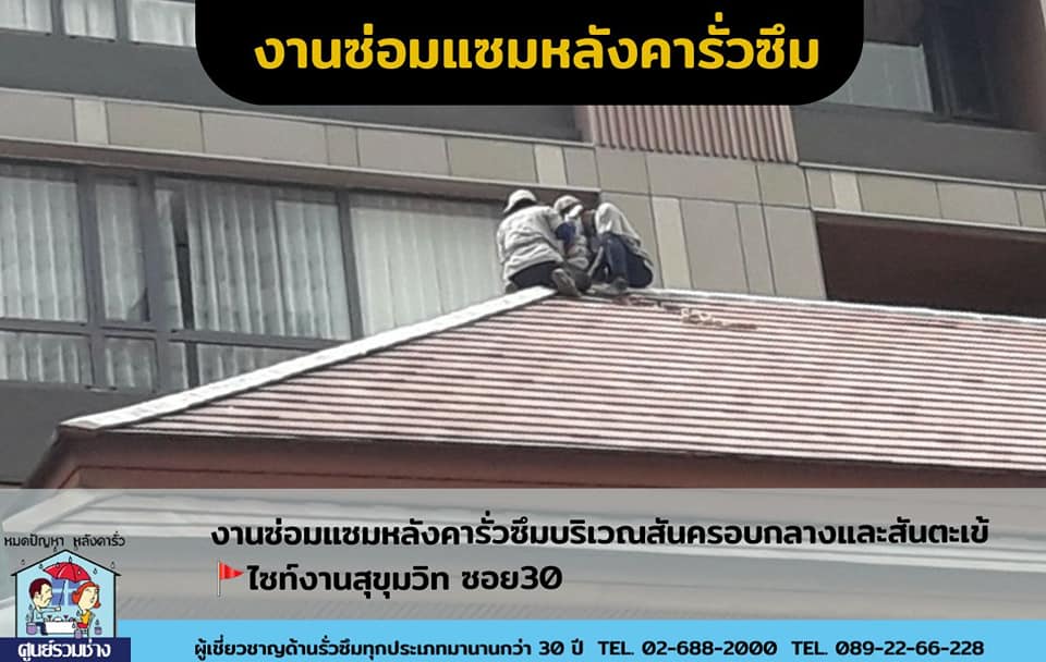 ศูนย์รวมช่าง ซ่อมหลังคารั่วซึม ดาดฟ้ารั่วซึม ห้องน้ำรั่วซึม โรยตัวซ่อมรั่วอาคารสูง งานรั่วซึมทุกประเภททั้งงานบ้าน องค์กร โกดัง โรงงาน ฯลฯ ด้วยการบริการที่ครบวงจรและเทคโนโลยีที่ทันสมัยรวมถึงกันซึมที่นำเข้าจากต่างประเทศมีความยืดหยุ่นและมีประสิทธิภาพสูง ด้วยประสบการณ์การทำงานด้านรั่วซึมมากกว่า 30 ปี พร้อมรับประกันผลงาน ที่จะทำให้คุณมั่นใจไว้วางใจให้เราดูแล